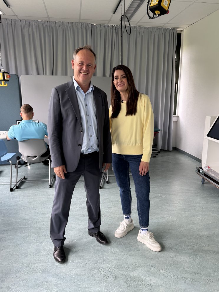 „Unsichtbares sichtbar machen“ antwortete Prof. Dr. Jochen Kuhn, Lehrstuhlinhaber der Physik-Didaktik des LMU München auf die Frage, wo ein Mehrwert von AR- und VR-Technologie sei. So wurden Modelle entwickelt, um beispielsweise den Teilchendetektor in Cern erlebbar und begreifbar zu machen. Auch für die Quantenphysik und den Physik-Nobelpreis zur Attosekunde wurden spielerische Zugänge entwickelt. Linda Zervakis testete unerschrocken im Rahmen einer Reportage von Pro7 zum Thema „Bildung in der Zukunft“ alles aus und stellte fest, dass Physik so auch seinen Status als angstbesetztes Fach für Viele verlieren könne. Schülerinnen und Schülern schaute sie beim Blick über die Schulter zu, wie sie in der KI-gestützten Lernplattform LeapPro mit personalisiertem Feedback Erkenntnisse gewinnen und gleichzeitig Bewertungen vornehmen konnten. Dazu wurden Spiegelbilder in Bergseen, der Flug eines Eichhörnchens oder der Start eines Flugzeugs mit dem digitalen Lernbegleiter ausgewertet. Mit dieser Unterstützung gelingt auch das Auswerten von Messdaten einer Skiabfahrt, die mit dem eigenen Smartphone aufgenommen worden waren. Dieser Zugang holt die Kinder und Jugendlichen in ihrer Lebenswelt ab, motiviert intrinsisch und bietet auch gleichzeitig die Möglichkeit des Lernens über KI: Eine Skiabfahrt mit 540 km/h mag zwar schmeichelhaft, aber keineswegs realistisch sein. Daher ist für die Erkenntnisgewinnung Fachwissen nach wie vor unabdingbar. Linda Zervakis wollte vom Schulleiter Peter Sander wissen, ob er optimistisch in die Zukunft schaue und wie es um das technische Equipment in den Schulen bestellt sei. „Hier ist das Gymnasium Röhrmoos hervorragend aufgestellt. Den Chancen und Herausforderungen im Zeitalter von KI müsse man pädagogisch begegnen, die neuen Möglichkeiten optimistisch sehen und sich gleichzeitig den medienpädagogischen und ethischen Gefahren bewusst sein und in eine reflektierte Diskussion eintreten.“ meinte Peter Sander. Die Zusammenarbeit mit der LMU München bietet großes Potential, um auch Lernprozesse besser entfalten und die zugehörige Lernwirksamkeit untersuchen zu können.
