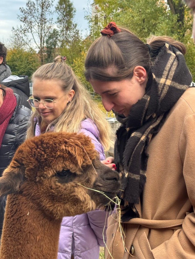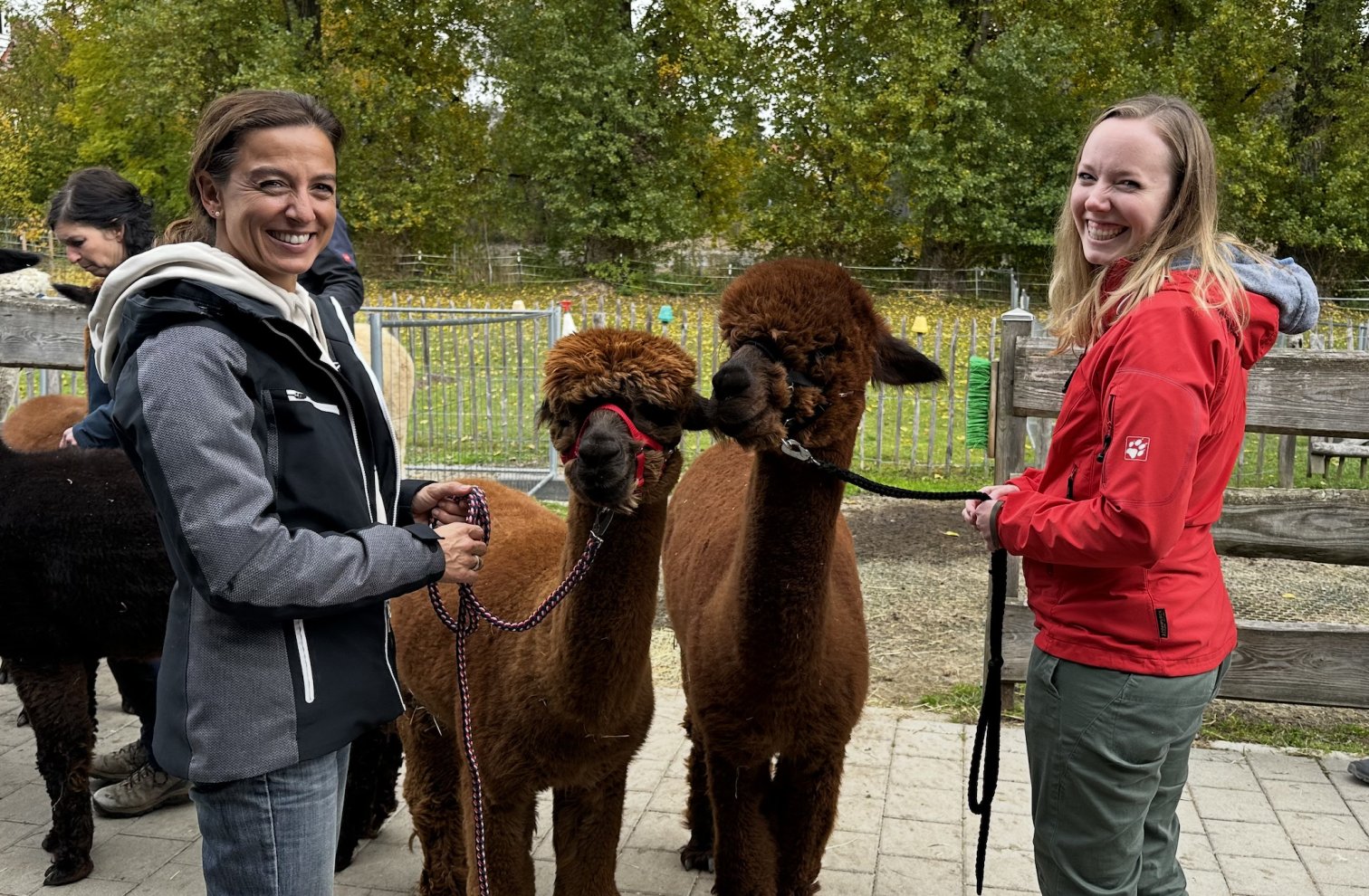 Mit Linus, Vitus und Co. unterwegs waren am Montagnachmittag unsere Lehrerinnen und Lehrer. Es gab am Gymnasium Röhrmoos diese Woche jedoch keinen zweiten Wandertag mit den einzelnen Klassen, auf dem "Stundenplan" stand dieses Mal stattdessen der gemeinsame Ausflug unsere Kollegiums - und der führte die knapp 30 Lehrerinnen und Lehrer nach Sigmertshausen zum Bruggerhof und deren knapp 20 Alpakas. Nach einem gemeinsamen Mittagessen in Markt Indersdorf bekam unser Kollegium zunächst von Kathrin und Hans Loder einen kurzen Einblick in die Arbeit und den Umgang mit den flauschigen Tieren. Und dann freuten sich Vitus, Linus und sieben weitere Alpakas darauf, mit den Gästen auf eine knapp zweistündige Wanderung zu starten, die fast bis an die Schule in Röhrmoos und wieder zurück führte. Während der Wanderung ergaben sich zahlreiche tolle Gespräche, viele Kollegen nutzten die Gelegenheit, sich noch besser kennenzulernen. Schließlich haben sich auch unsere Lehrkräfte erst vor kurzem kennengelernt. Auch laufen bereits Planungen und Gespräche mit Familie Loder, die Arbeit mit den Alpakas eventuell in den Schulalltag mit einzubauen.