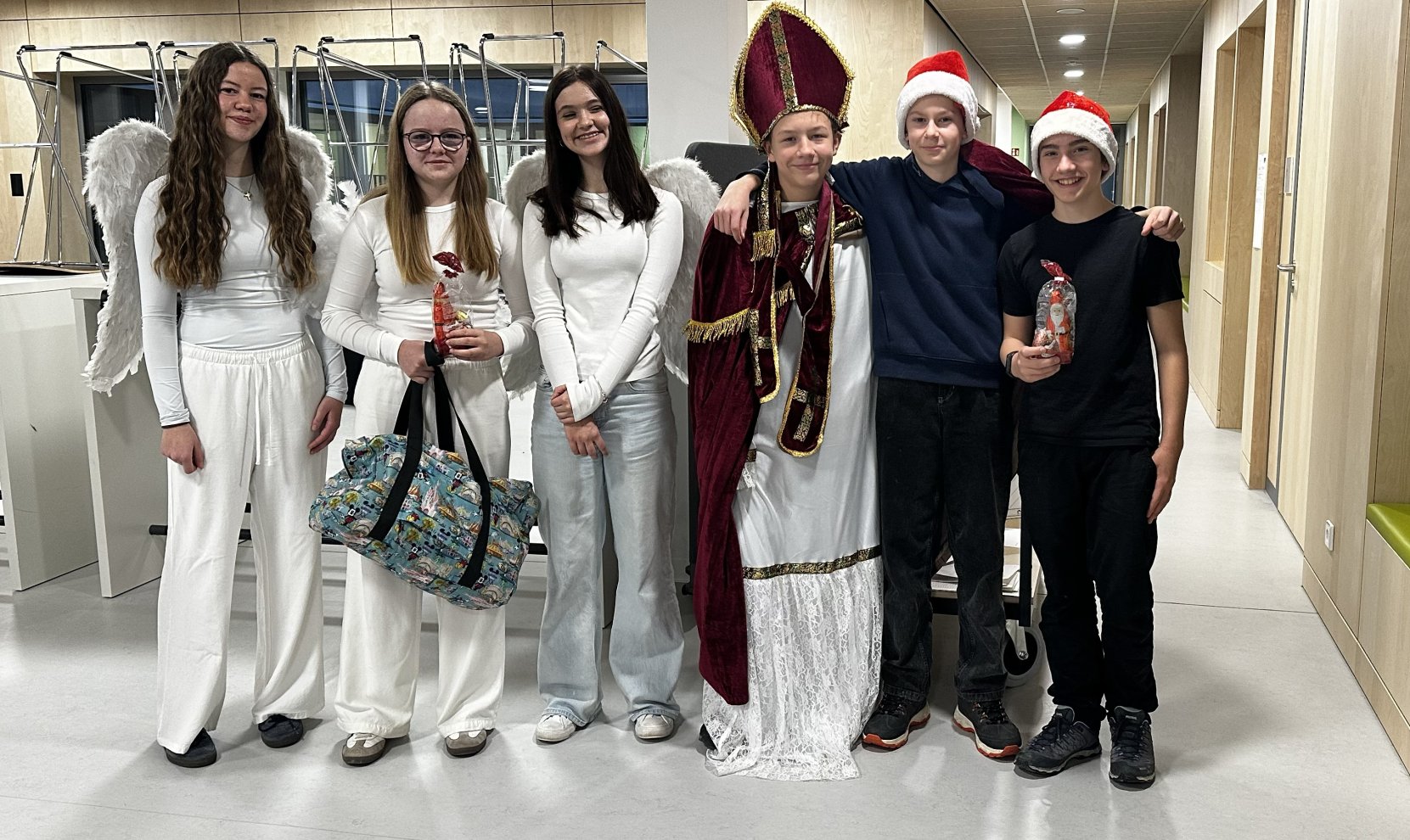 „Ho, ho, ho“, tönte es am Montagvormittag durch das Gymnasium Röhrmoos. Der Grund? Bischof Nikolaus, weit gereits aus Myra, war mit seiner Entourage im GMR-Schulhaus unterwegs. Engagiert hatte ihn unsere SMV, die mit ihrer ersten Aktion gleich einen Volltreffer landen konnte: Eine Organisationsgruppe aus mehreren Schülern hatte zur beliebten Nikolaus-Aktion gerufen, und knapp 100 Schülerinnen und Schüler waren dem Aufruf gefolgt und hatten sich gegenseitig und auch mancher Lehrkraft ein kleines Nikolaus-Packerl geschickt. Darin waren – aus fair gehandelter Produktion – ein großer Schoko-Nikolaus und zwei kleine Schoko-Christbaumkugeln. Die Packerl wurden nun am Montag, zum teil anonym, zum Teil mit einer Botschaft versehen, in unseren Klassen verteilt. Mancherorts ernteten die Verteiler erstaunte, vor allem aber äußerst freudige Blicke über die gelungenen Überraschungen.