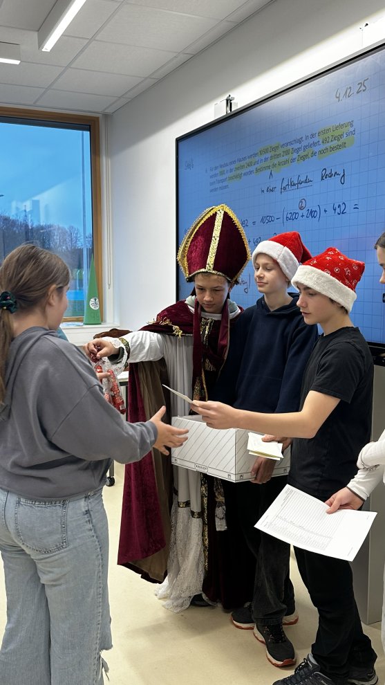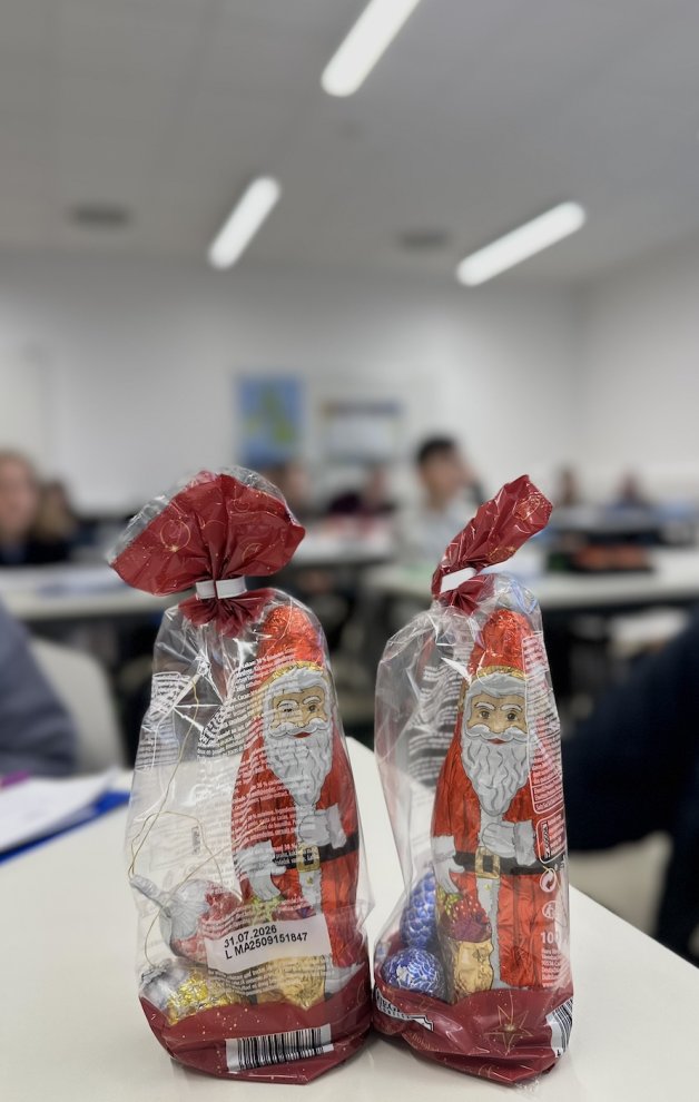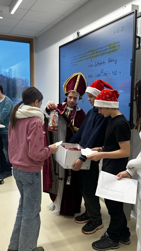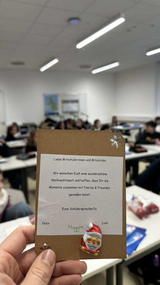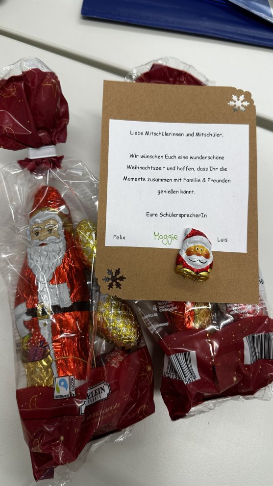 Leer musste am Montag aber sowieso niemand ausgehen: Unsere drei Schülersprecherinnen und Schülersprecher hatten, dank der Spende von Familie Heck, als Einstandsgeschenk für jeden unserer 285 Schülerinnen und Schüler einen Mini-Nikolaus und eine kleine, goldige Weihnachtskarte vorbereitet. Vielen Dank, Magdalena, Felix und Luis, und vor allem an Familie Keck für die großzügige Spende! Somit steigt auch bei uns am GMR die Vorfreude auf Weihnachten immer mehr.