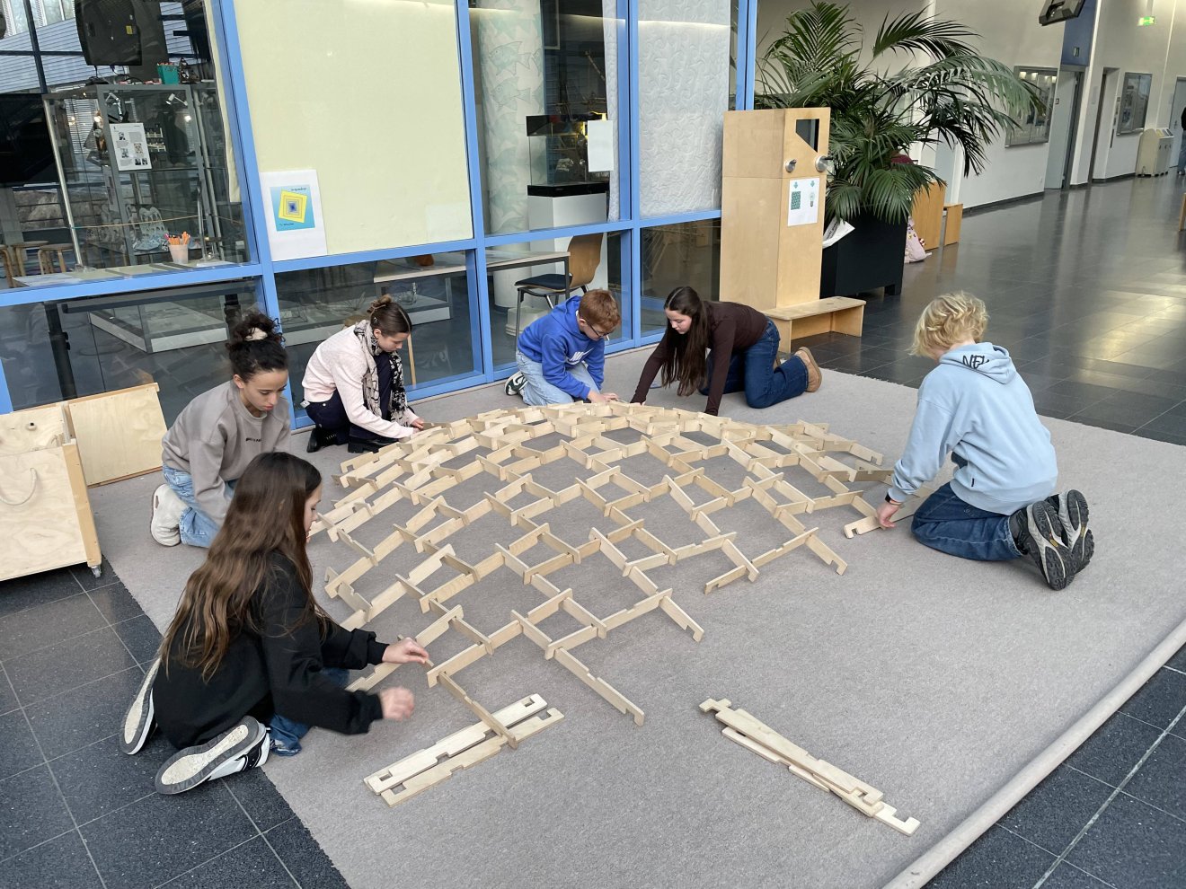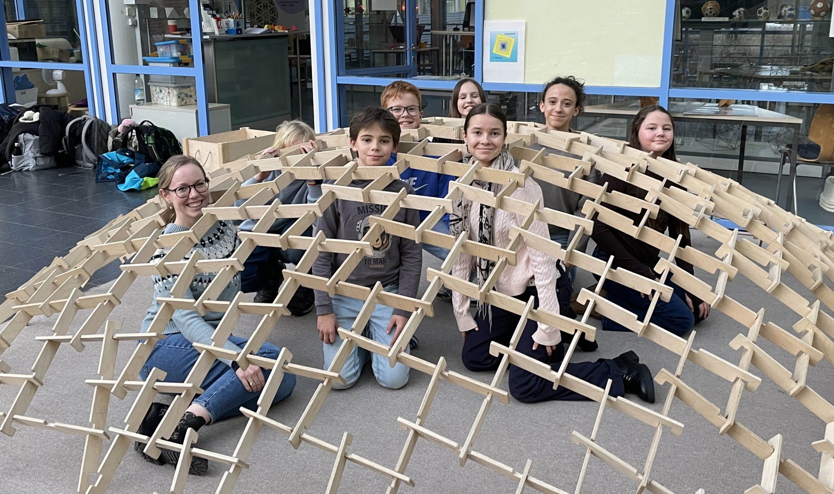 Ob platonische Körper zum Nachbauen, Rechnen mit einer Parabel, statistische Vorhersagen an der Murmelbahn oder spannende Einblicke in die projektive Geometrie – überall wurde ausprobiert, gebaut und gestaunt. Ein besonderes Gemeinschaftserlebnis war der Bau einer Da Vinci Kuppel.