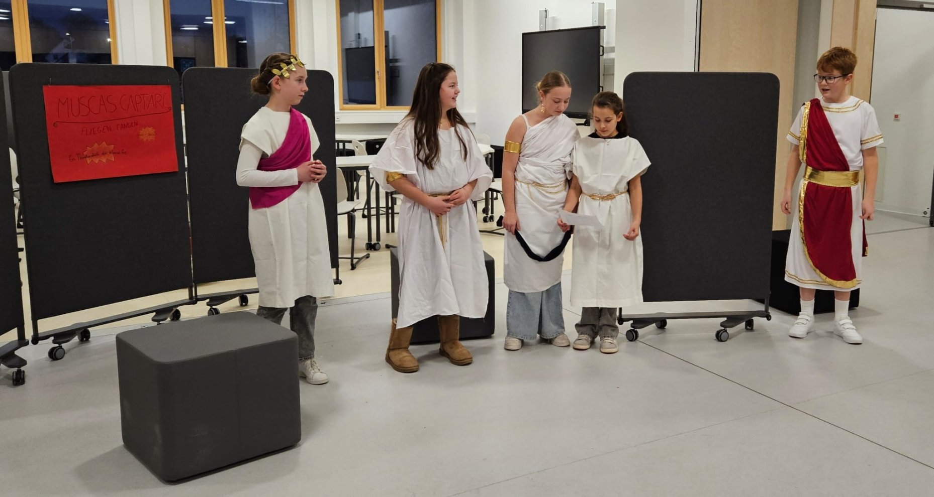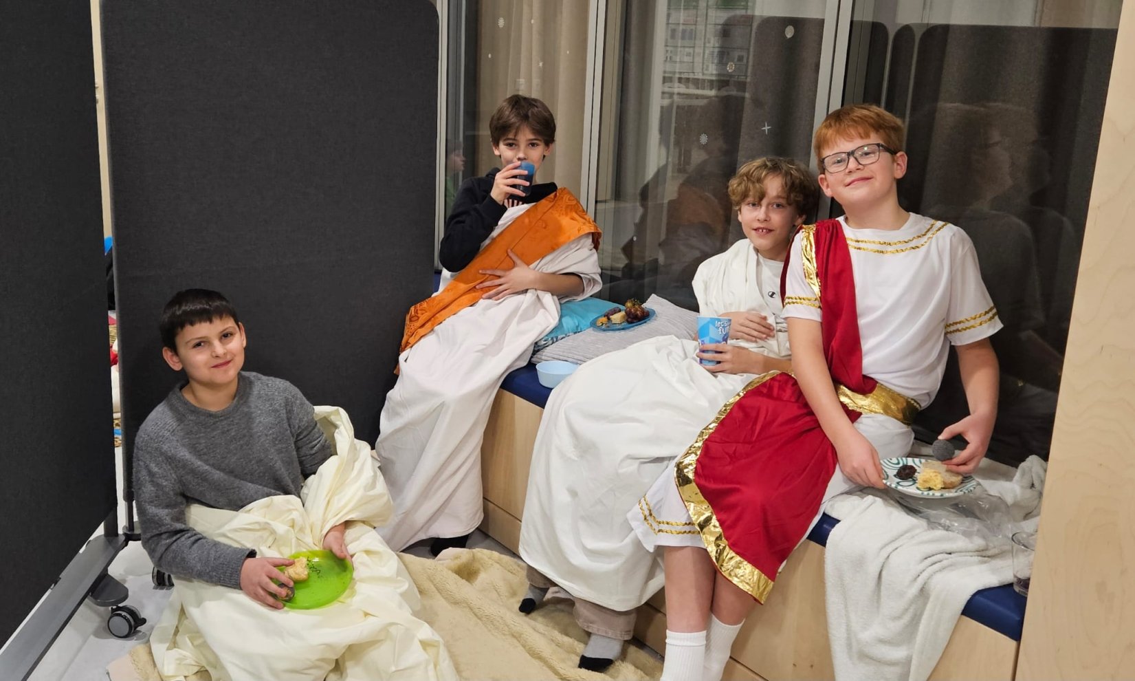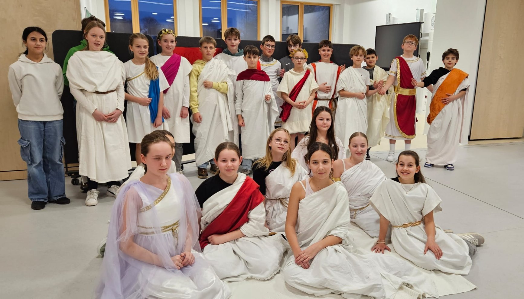 Vivat Roma et lingua Latina! So schallte es am Donnerstagabend durch das Lernhaus der 6. Klassen. Die Lateinschülerinnen und Schüler aller 6. Klassen trafen sich gegen Abend, um die erste NOX LATINA am GMR zu begehen. Im Vorfeld wurden Rezepte studiert, Filme zu römischem Essen angesehen und sogar ein Theaterstück einstudiert. In Toga und Tunika gewickelt kamen die motivierten Lateiner um den Abend zusammen mit ihren Lateinlehrerinnen Frau Zobel und Frau Wernthaler in der Schule zu verbringen. Nach der Vorführung des Theaterstücks „Muscas captare“ durch die 6c wurde bei lateinischer Musik das römische Buffet geplündert, wo es unter anderem Libum, ein altrömisches Opferbrot, Globi (Mohnknödel), Moretum (Kräuterkäse) und einen römischen Nachtisch mit Gries und Pinienkernen zu genießen gab. Man war sich schnell einig: schlecht lebten die Römer nicht. Frisch gestärkt ging man daran, römische Spiele auszuprobieren, so z.B. Zielwerfen von Walnüssen auf eine Amphora, Mühle oder das Fischespiel – ludus piscis.