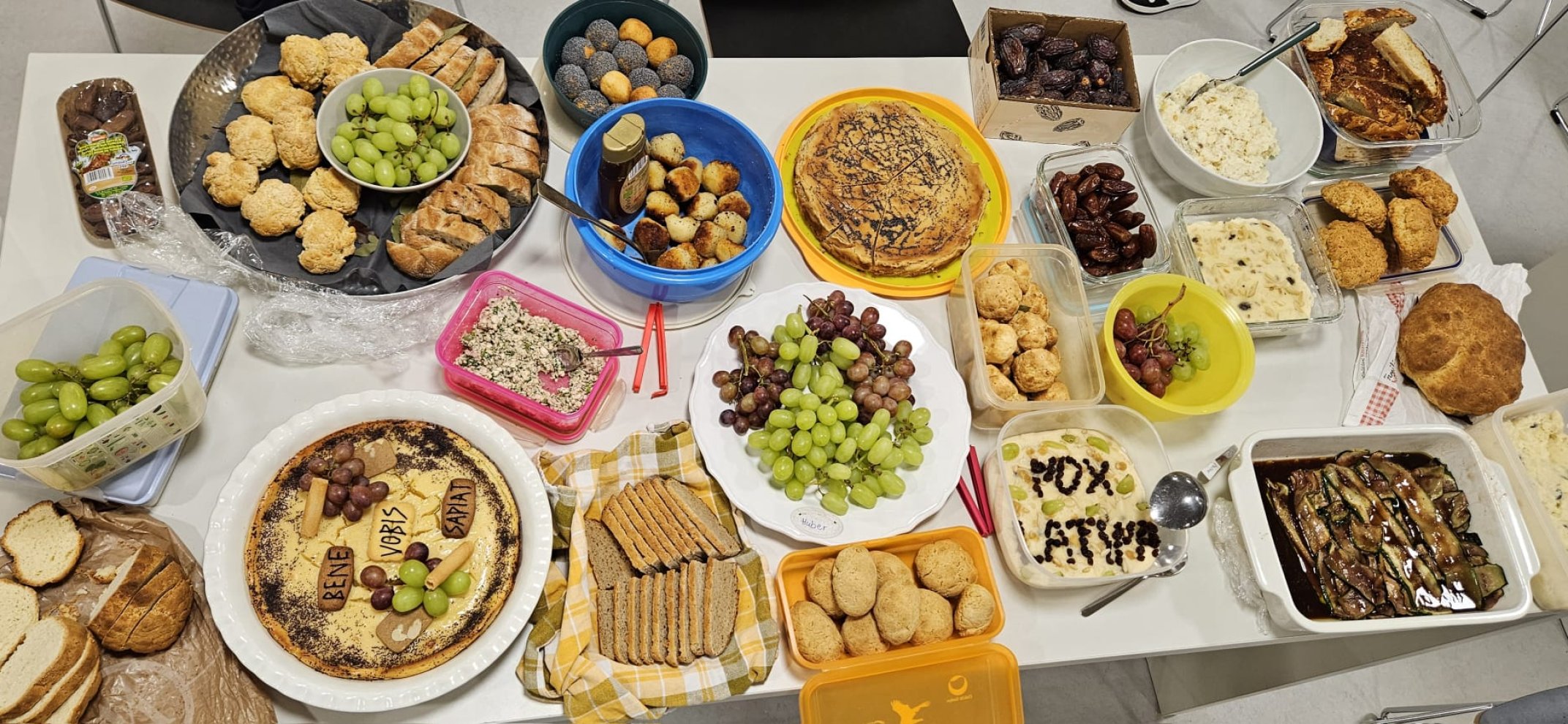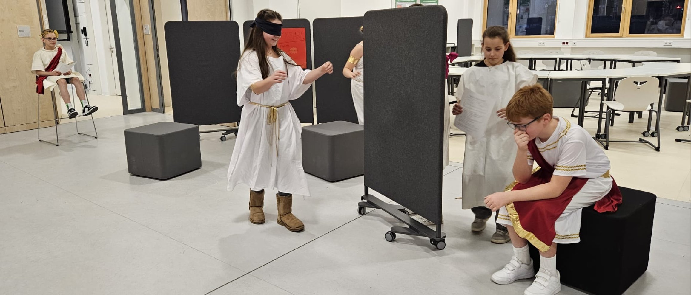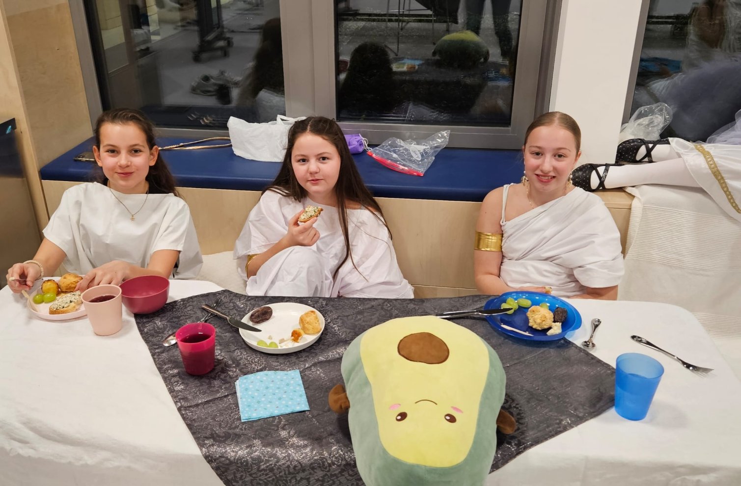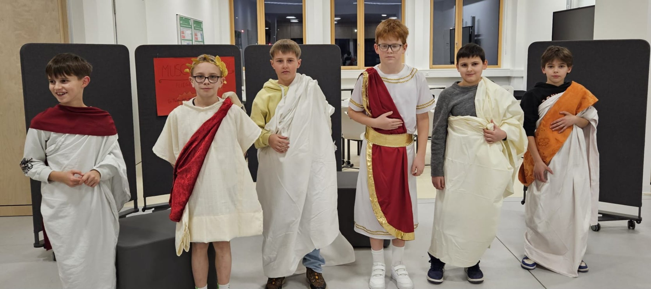 Vivat Roma et lingua Latina! So schallte es am Donnerstagabend durch das Lernhaus der 6. Klassen. Die Lateinschülerinnen und Schüler aller 6. Klassen trafen sich gegen Abend, um die erste NOX LATINA am GMR zu begehen. Im Vorfeld wurden Rezepte studiert, Filme zu römischem Essen angesehen und sogar ein Theaterstück einstudiert. In Toga und Tunika gewickelt kamen die motivierten Lateiner um den Abend zusammen mit ihren Lateinlehrerinnen Frau Zobel und Frau Wernthaler in der Schule zu verbringen. Nach der Vorführung des Theaterstücks „Muscas captare“ durch die 6c wurde bei lateinischer Musik das römische Buffet geplündert, wo es unter anderem Libum, ein altrömisches Opferbrot, Globi (Mohnknödel), Moretum (Kräuterkäse) und einen römischen Nachtisch mit Gries und Pinienkernen zu genießen gab. Man war sich schnell einig: schlecht lebten die Römer nicht. Frisch gestärkt ging man daran, römische Spiele auszuprobieren, so z.B. Zielwerfen von Walnüssen auf eine Amphora, Mühle oder das Fischespiel – ludus piscis.