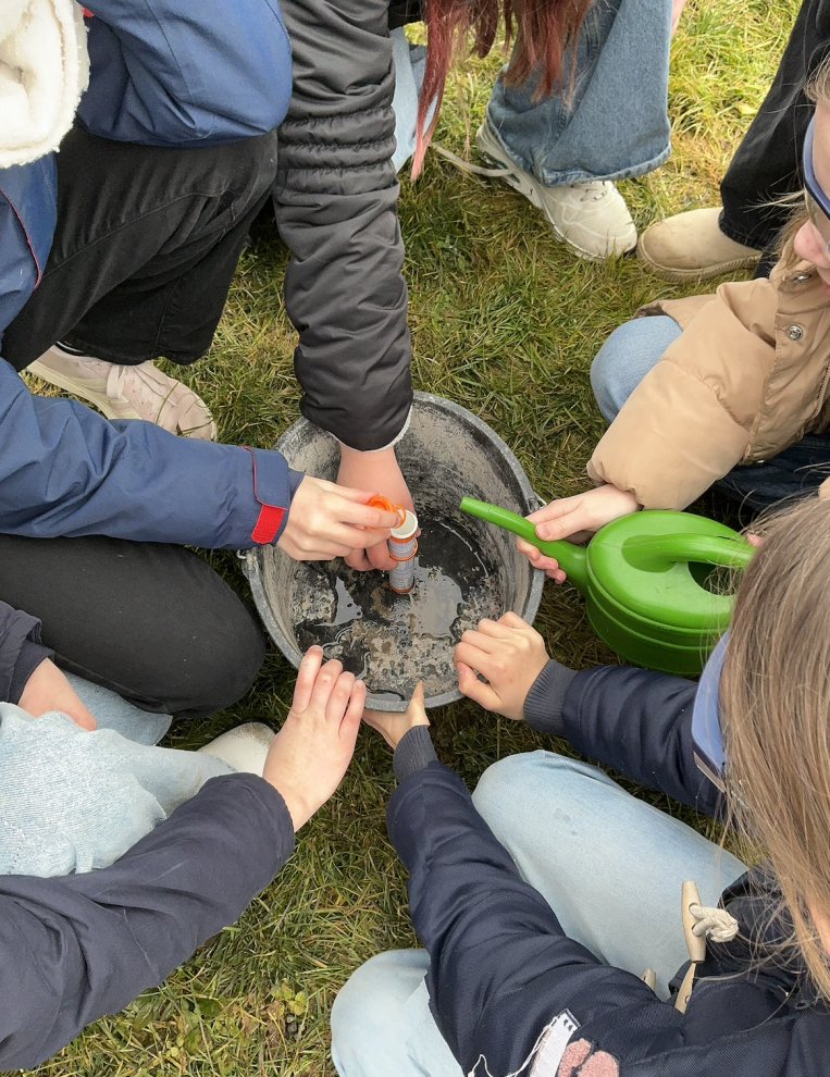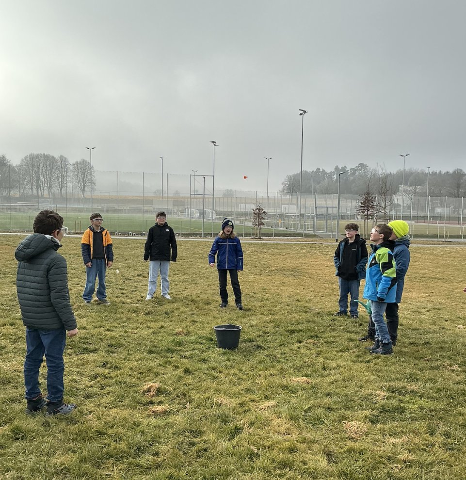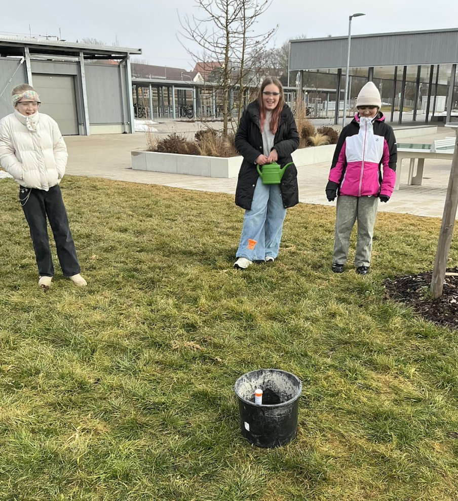 Heute hieß es raus aus dem NuT Klassenzimmer und ab auf den Pausenhof. Hier durften die Schülerinnen und Schüler der Klasse 5b das Zusammentreffen von Wasser und einer Brausetablette in einem Brauseröhrchen erforschen. Ausgerüstet mit Schutzbrillen, wurde das Experiment mit viel Spannung in Gruppen ausprobiert. Die Freude war groß, als die ersten Raketen, die Deckel der Brauseröhrchen, in die Luft flogen. Immer wieder wurde das Experiment wiederholt und fleißig angefeuert. Anschließend wurden gemeinsam die Hintergründe für diesen Raketenstart erarbeitet.