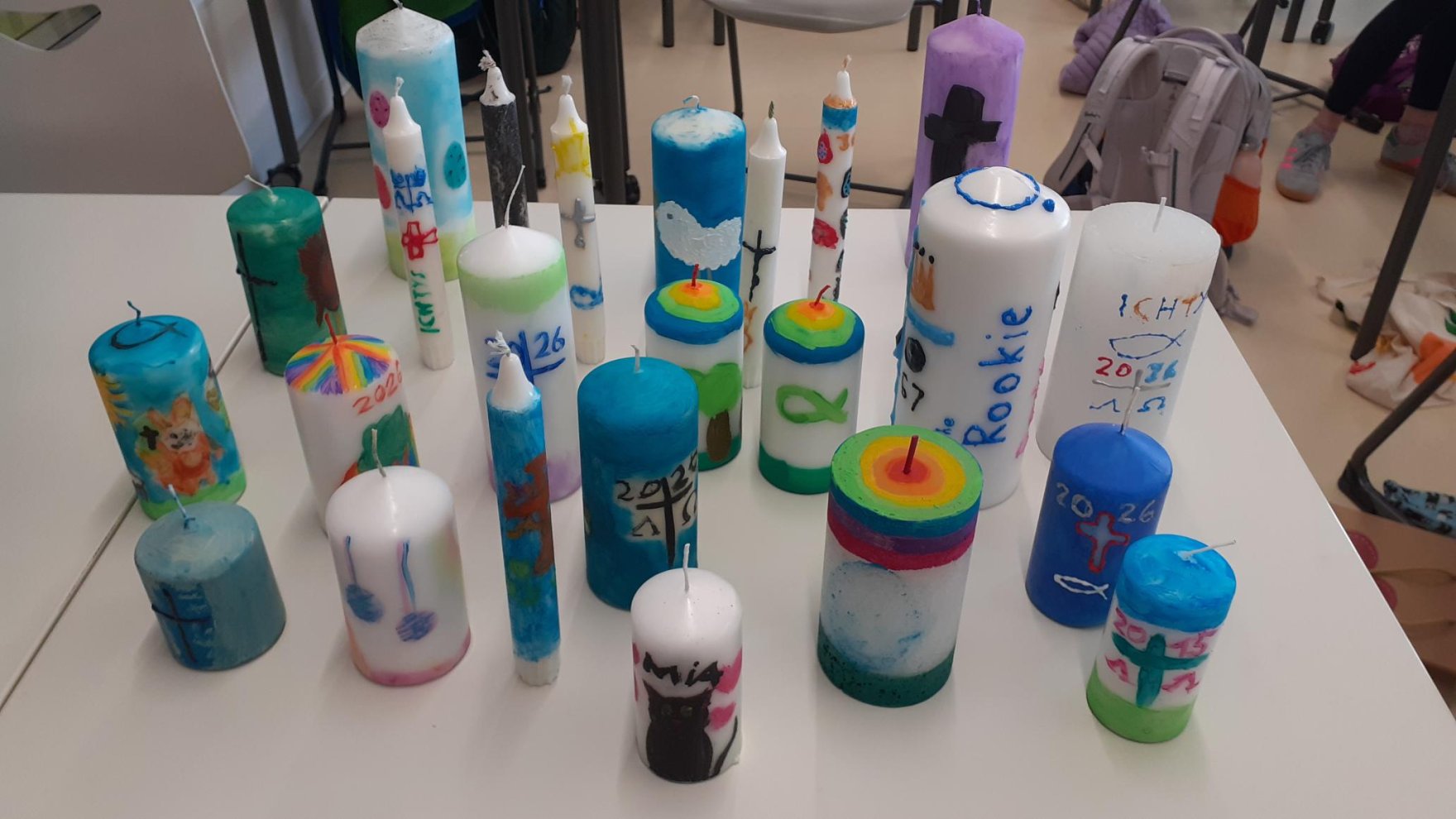 Bunt und vielfältig sind die Osterkerzen, die Schülerinnen und Schüler der 5. und 6. Jahrgangsstufe im Religionsunterricht gestalteten und schon die Vorfreude auf das Osterfest erahnen lassen. Neben Frühlingsmotiven, bunten Eiern und dem Osterhasen, erfreuten sich auch traditionelle, christliche Motive wie das Kreuz, Alpha und Omega, die Taube, der Fisch, der Regenbogen oder das Lamm großer Beliebtheit.