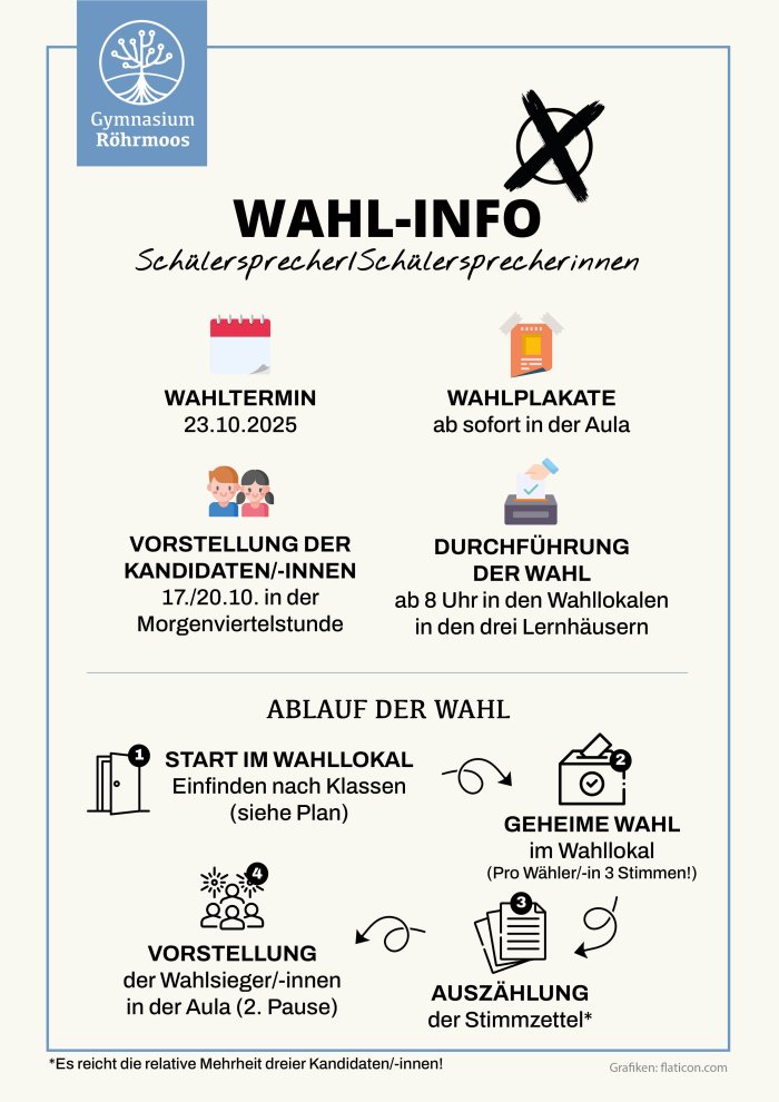 Wir lieben demokratische Entscheidungen, und deswegen haben wir uns dazu entschlossen, die Wahl der allerersten Schülersprecherinnen und Schülersprecher am Gymnasium Röhrmoos in einem deutlich demokratischen Prozess zu wählen – und zwar mit allen unseren Schülersprecherinnen und Schülersprechern, nicht mur über die "Wahlmänner" und "Wahlfrauen" der Klassensprecherinnen und Klassensprecher. Daher läuft die Wahl im Schuljahr 2025/2026 folgendermaßen ab: